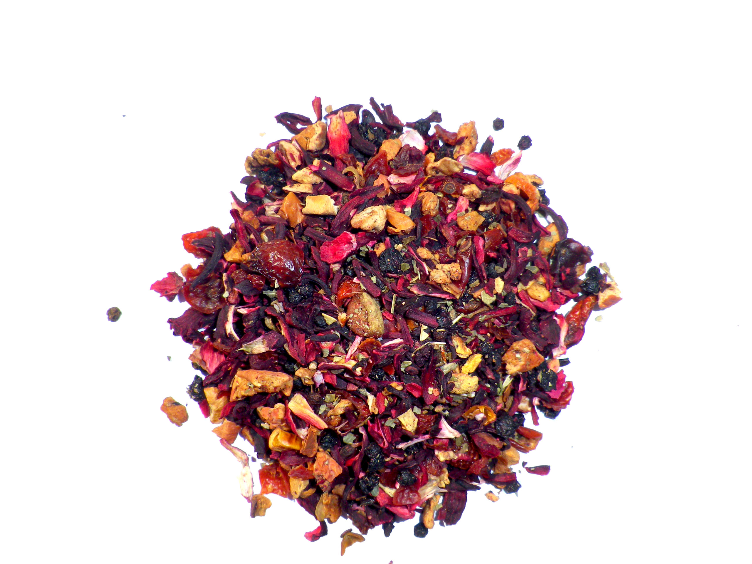Composition de Fruits des Bois : hibiscus, morceaux de pomme, écorce d’églantier, baies de sureau, feuilles de baies (feuilles mûres, feuilles de cassis), bleuets, arome.