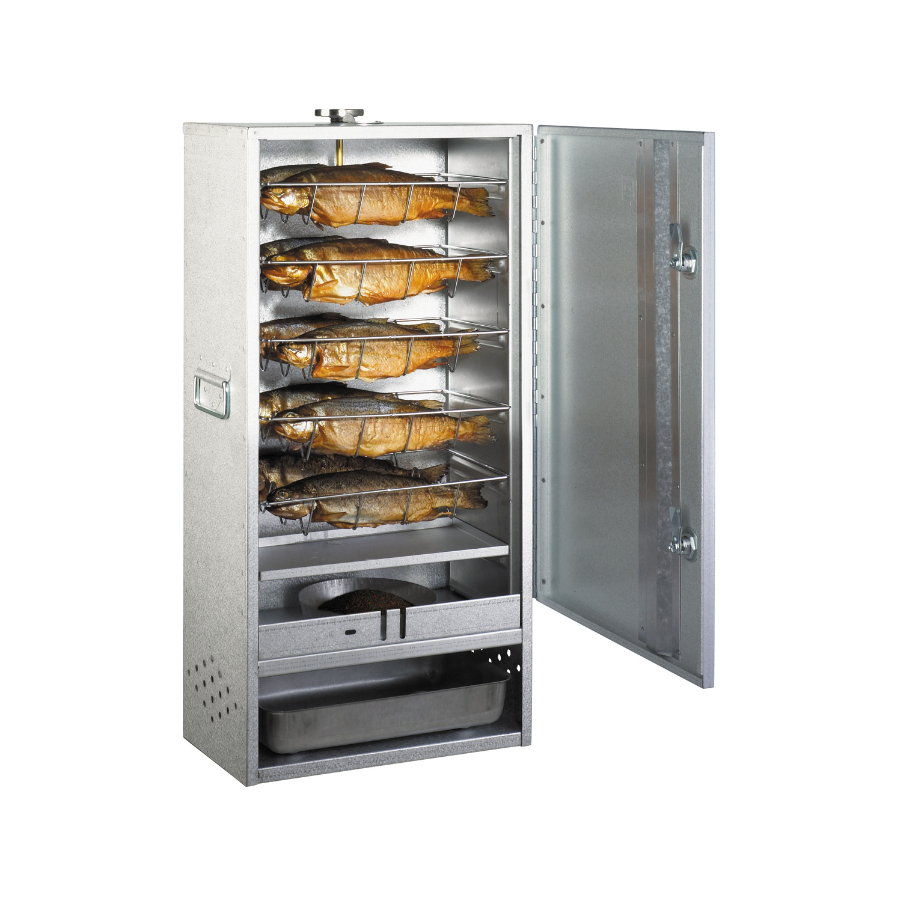 Le fumoir avec porte en tôle d’acier aluminé Peetz est fabriqué en Allemagne, en acier aluminé. Matériau robuste et plus abordable que l’inox, il vous confère un fumoir de qualité et durable. Sa grande taille de 85x39x28 (h x L x l) lui offre une polyvalence à toute épreuve, accessible à tous. Grâce à son système d’aération et son thermomètre directement accessibles depuis le dessus du fumoir, la gestion de la température devient un jeu d’enfant et vous êtes sûr de réussir vos fumages. Sa capacité à fumer 20 petits poissons en même temps grâce aux grilles vous permet de nourrir une grande tablée sans difficulté.