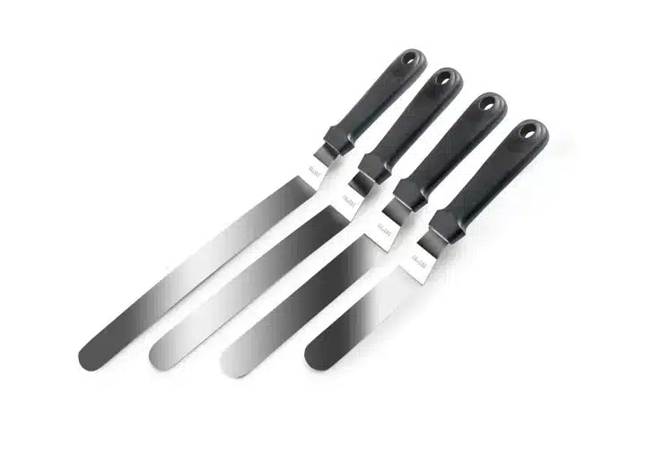 Spatule Coudée inox Ibili, de la gamme des ustensiles indispensables de la manufacture Ibili, La forme coudée du manche des spatules permet d’étaler facilement les pâtes et les mettre à niveau, facilite ainsi la manipulation des entremets mono-portion mais aussi équilibrer et enlever le surplus de glaçage.