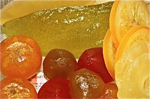 L’assortiment de fruits confits se compose de : Quatre clémentine, une poire blanche, une poire rouge, une figue, un morceau de cédrat, un abricot, une écorce d’orange et de citron, un morceau d’angélique et des bigarreaux.