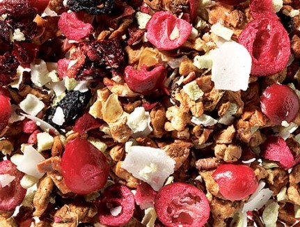 Composition du Chasseur de nuages : griottes entières et morceaux de cerises, chips de coco, morceaux de kiwi, pommes, tranches de cranberry, arome