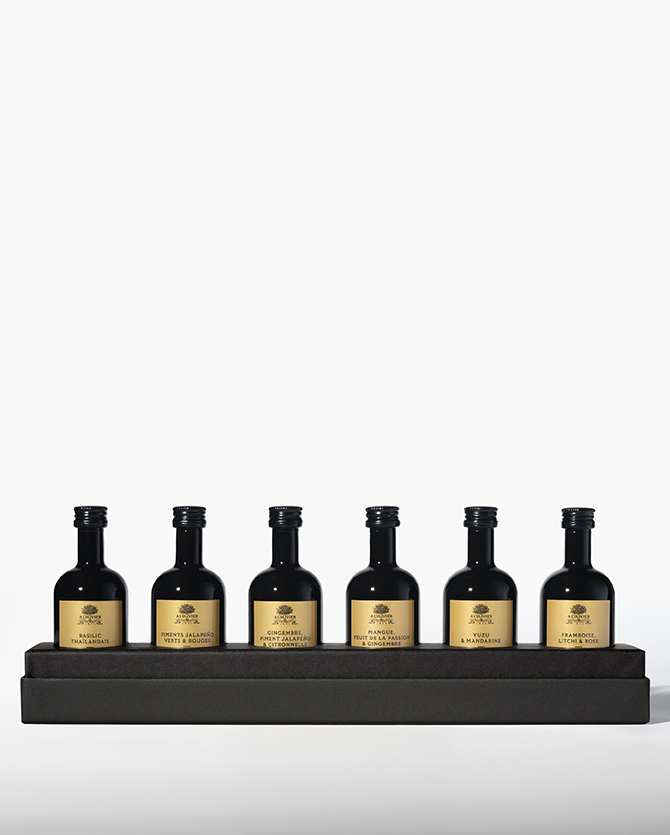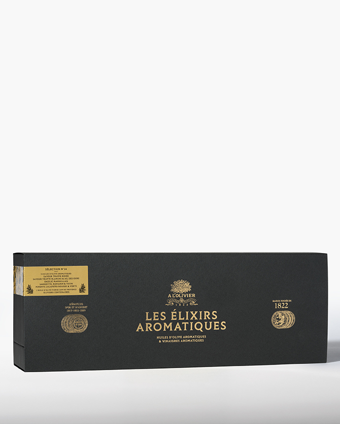 Élaborés à partir d’ingrédients d’exception, infusés selon une méthode qui concentre tous les arômes des plantes fraîches, ces huiles et vinaigres aromatiques présentés en coffret sont à placer sur votre table, à portée de main, pour laisser votre créativité s’exprimer jour après jour..