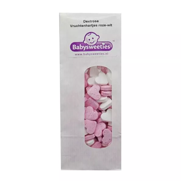 De populaire vruchtenhartjes in dextrosevariant. Deze dextrose vruchtenhartjes zijn roze/wit en daarom geschikt om de komst van een meisje bekend te maken. De dextrose vruchtenhartjes zijn per 175 gram verpakt in een stazak waardoor het een leuk weggevertje is.