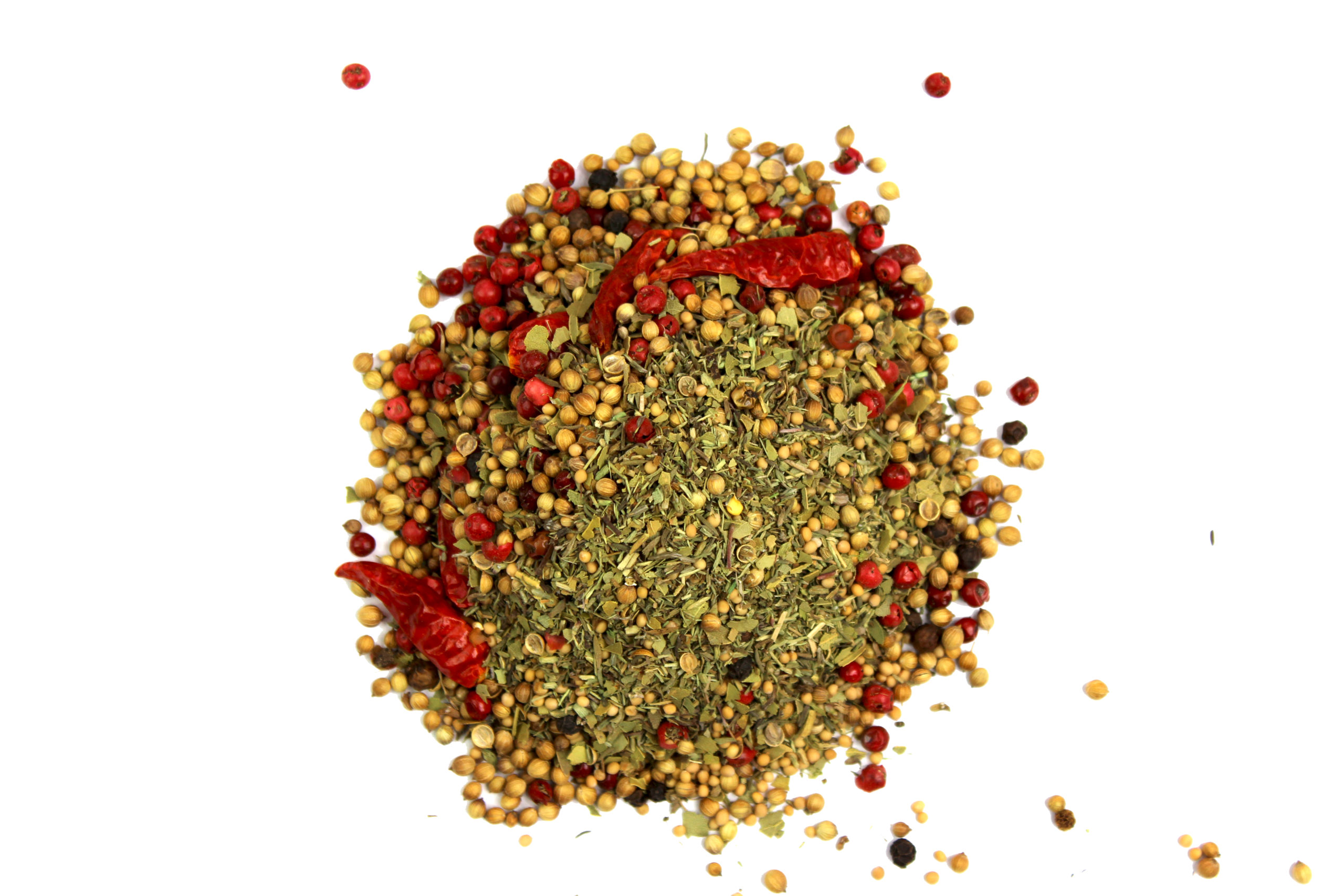 Composition du mélange pour marinade : thym, graines de moutarde, coriandre, laurier, baies roses, poivre noir, piments entiers.