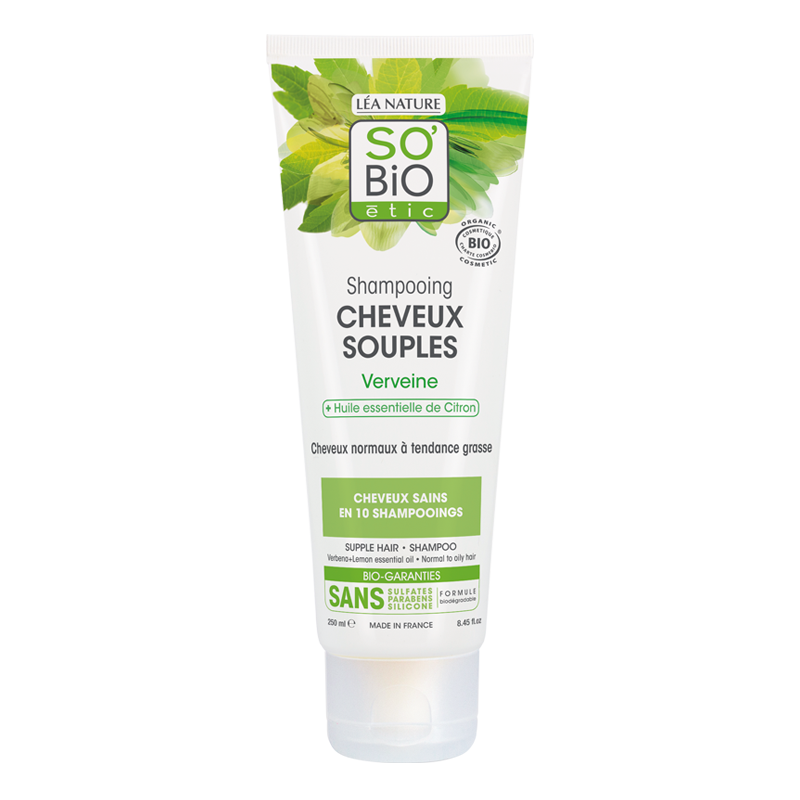 Appliquez le shampooing cheveux souples verveine SO’BiO étic sur cheveux mouillés, faites mousser et massez le cuir chevelu. Rincez avec soin.