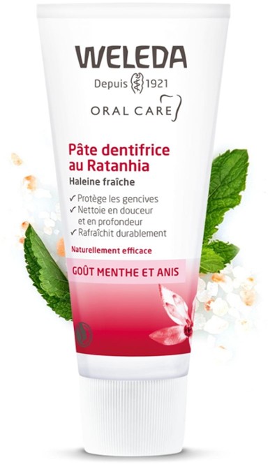 Faiblement abrasif, ce dentifrice nettoie en douceur et aide à lutter contre la plaque dentaire responsable de la formation des caries. A base d’extraits de ratanhia aux propriétés astringentes et de résine de myrrhe, traditionnellement connue pour ses vertus apaisantes et calmantes, ce dentifrice augmente la résistance des tissus et favorise la réduction de la sensibilité gingivale. Les huiles essentielles naturelles procurent une agréable sensation de fraîcheur.